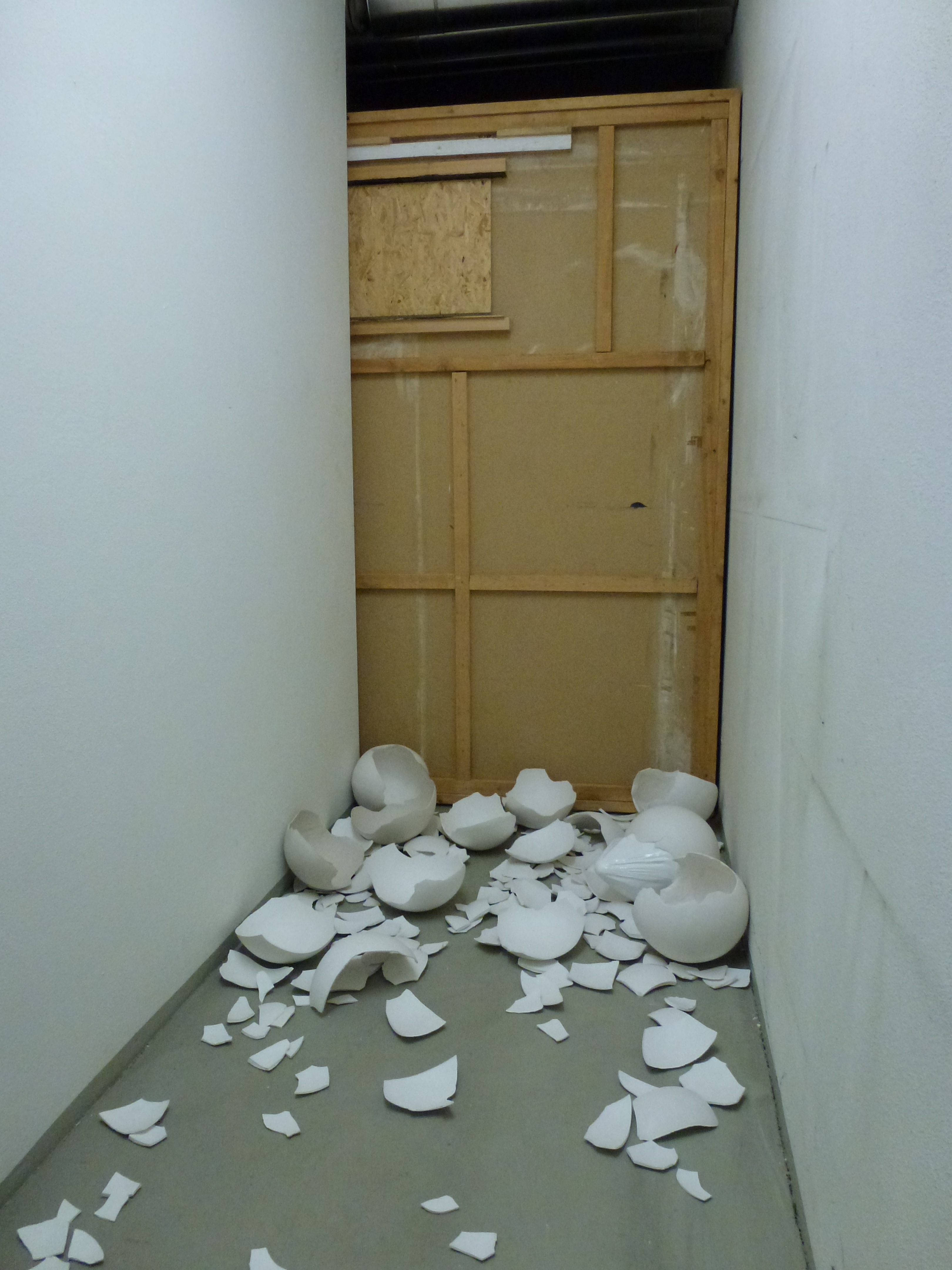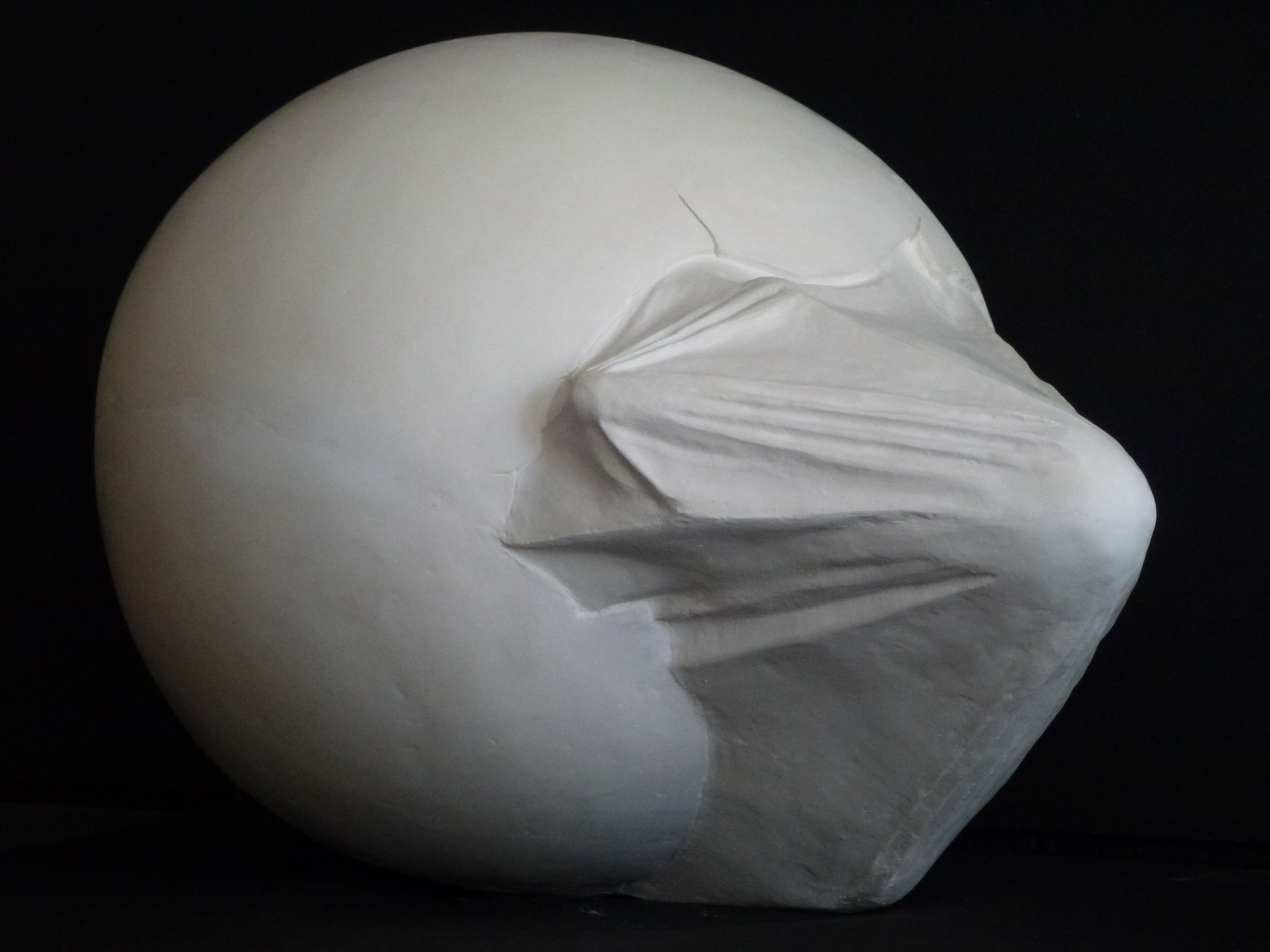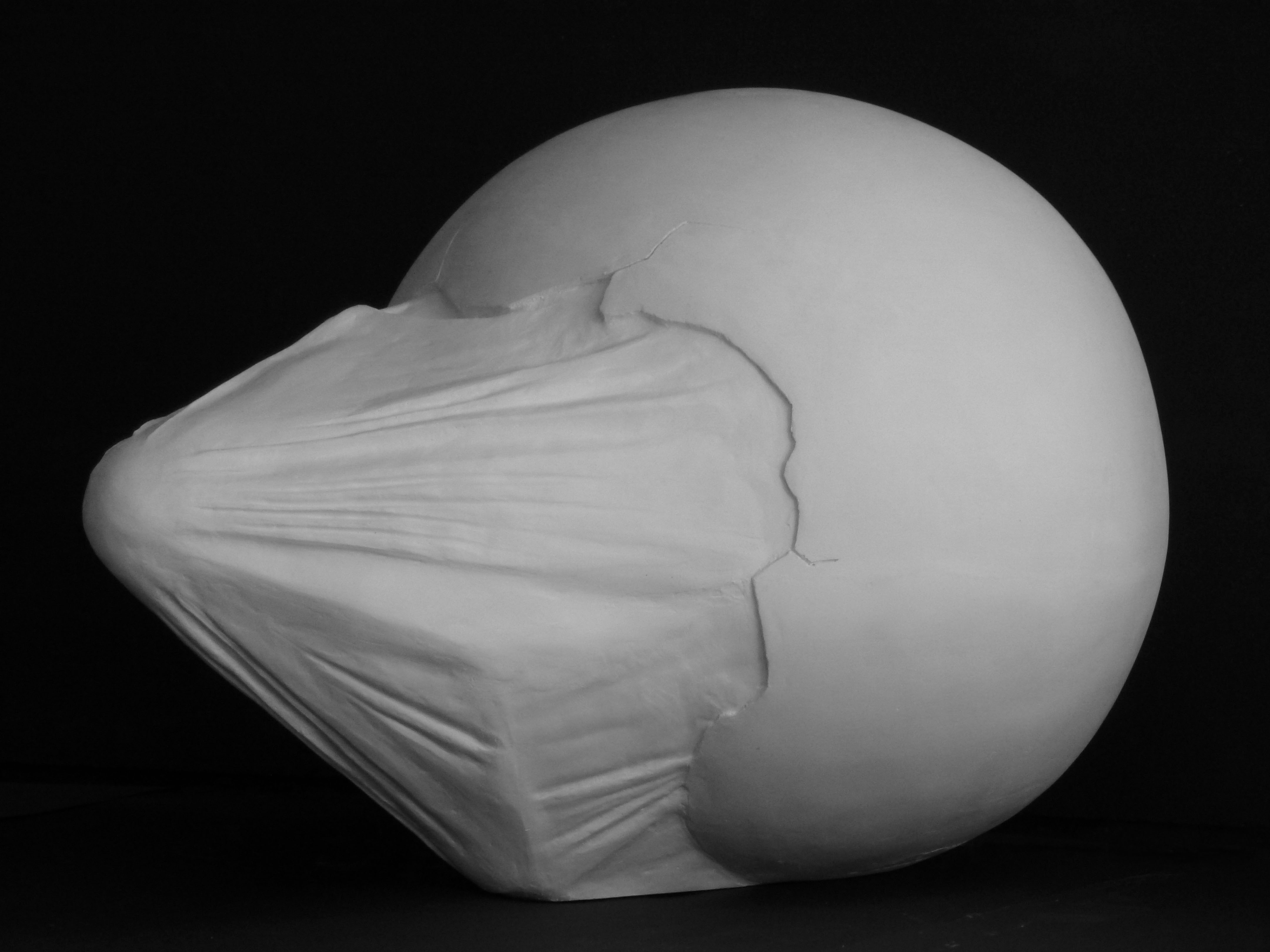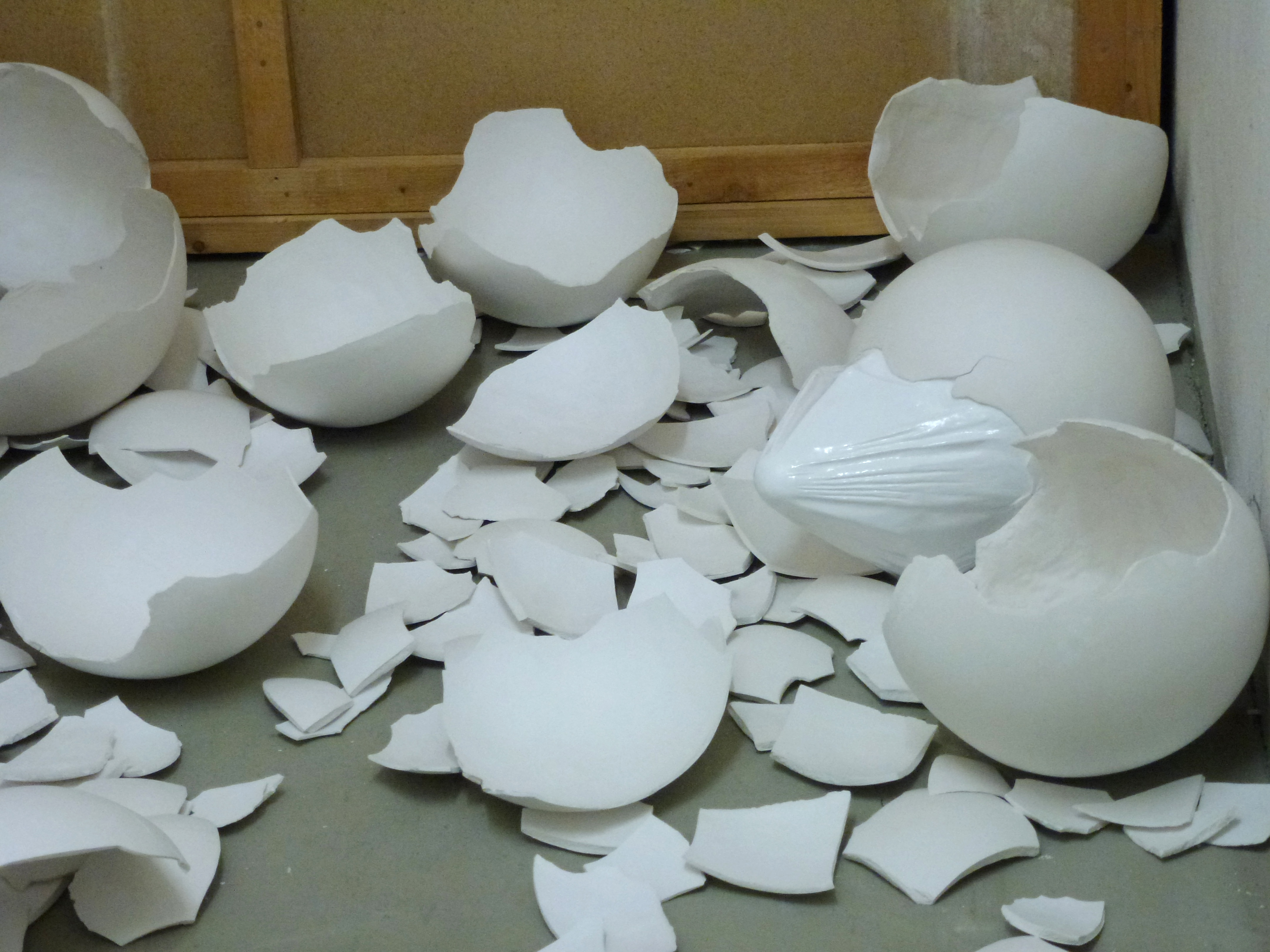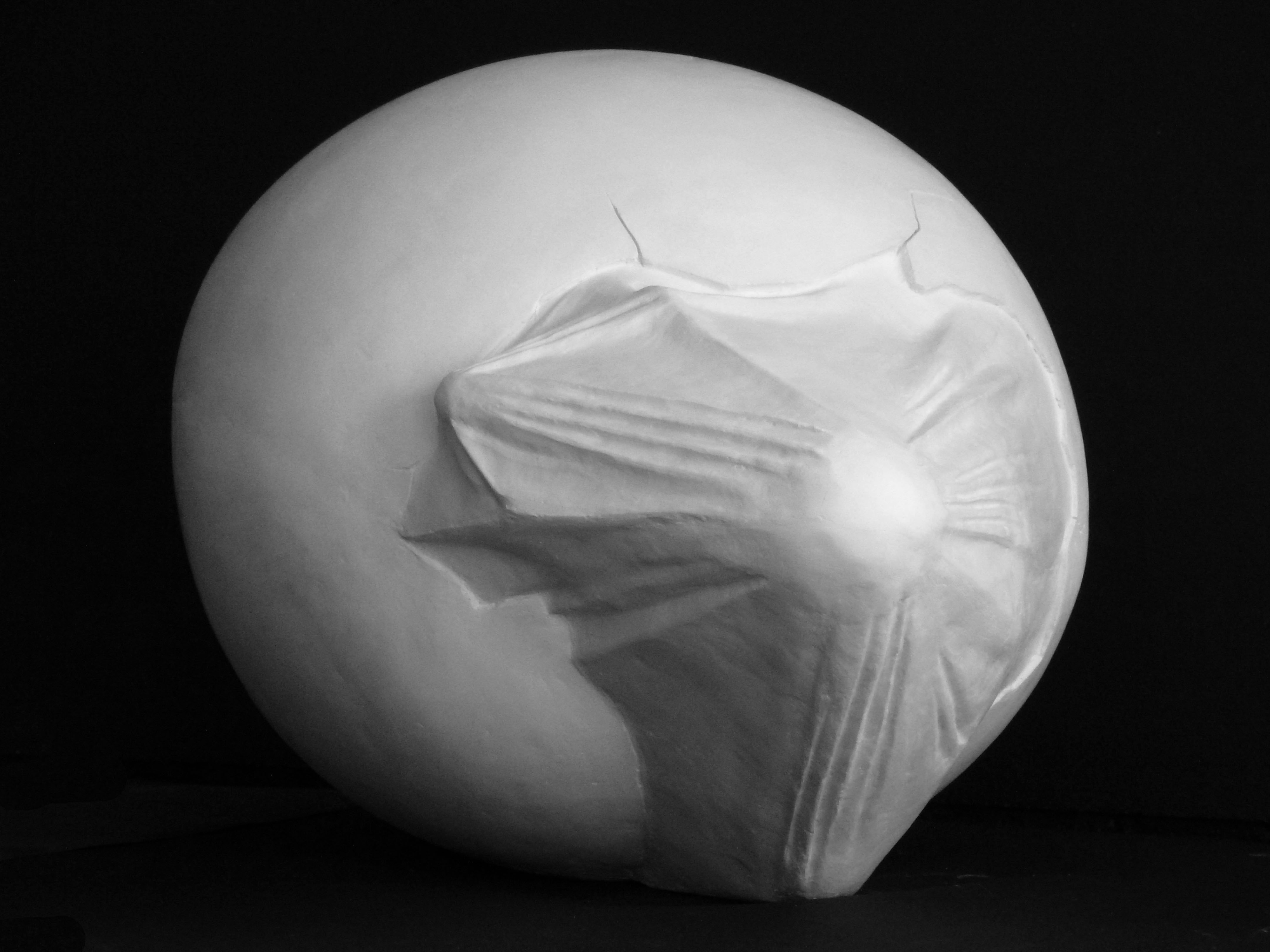 Ho iniziato analizzando il processo della schiusa delle uova e successivamente mi sono dedicato ad esaminare attentamente la loro struttura. All’interno di queste si trova sempre una sorta di pellicina, esattamente sotto la scorza dura del guscio. Ho trovato interessante il contrasto tra la morbidezza della pellicina interna e la durezza esterna dell’uovo. Questo contrasto si esplica nell’opera dall’incontro tra la perfetta geometria dell’uovo e le pieghe che questa pelle acquista sotto la spinta dell’animale che nasce. Nell’evoluzione del lavoro sono partito dallo studio sulla schiusa delle tartarughe per arrivare ad una completa astrazione dell’animale. Lo spettatore percepisce che c’è un qualcosa che si divincola per liberarsi ma non può capire cos’è in quanto tutto è ancora coperto dalla pellicina. Il lavoro è teso a rivelare la forza insita all’atto della nascita. Una volta realizzata la scultura, l’ho posta all’interno di una installazione formata da uova rotte, con l’intento di ricostruire una sorta di nidiata appartenente ad una specie sconosciuta, dove è possibile veder nascere alla luce l’ultimo esemplare.